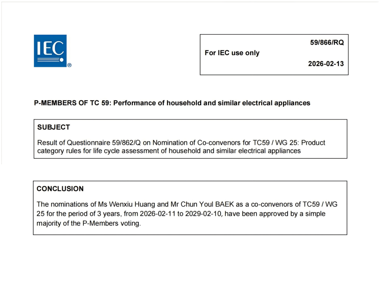 近日,国际电工委员会家用和类似用途电器的性能技术委员会(IEC/TC59)正式公布新成立的WG25工作组召集人任命,国机集团首席专家黄文秀与韩国专家联合担任IEC/TC59/WG25工作组召集人。该工作组全称为家用和类似用途电器全生命周期评价产品种类规则工作组,是全球家电领域绿色低碳评价标准研制的核心技术平台。此次中国专家牵头担任召集人职务,标志着我国在国际家电绿色标准领域的影响力实现新突破。