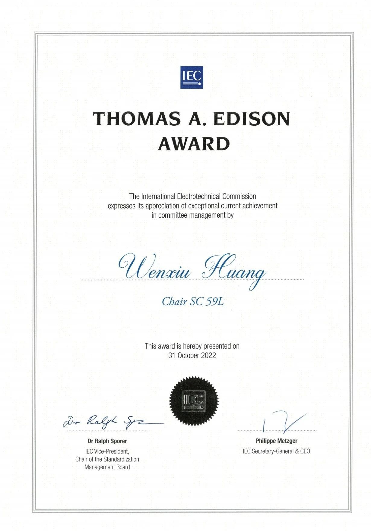 ●首席专家黄文秀荣获2022年度国际电工委员会最高技术管理奖“IEC托马斯·爱迪生奖”。